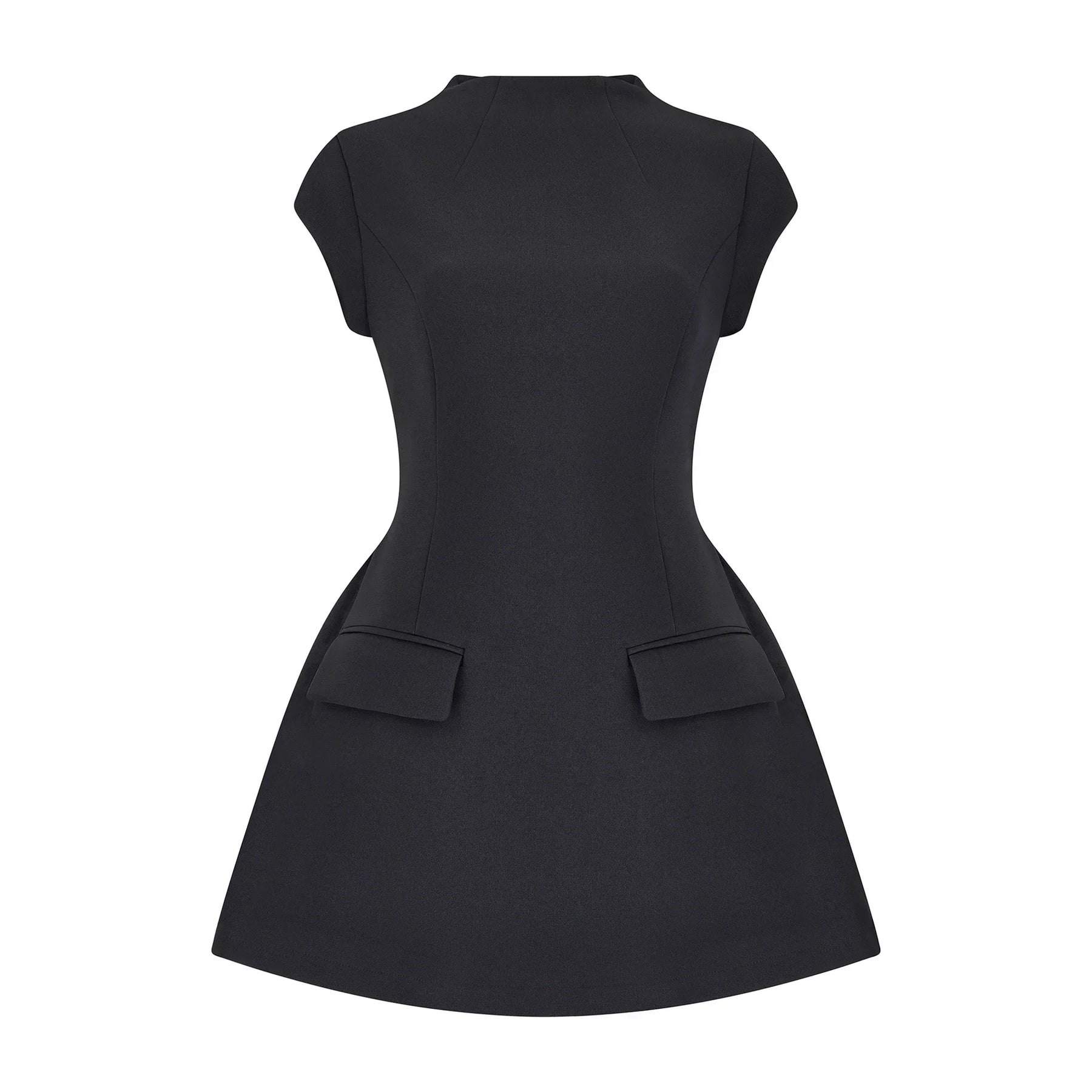 Discover the essence of timeless elegance with the Cassia Mini Dress, a sophisticated staple designed to elevate any wardrobe. This chic jet-black piece features an iconic cap sleeve and a flattering high neckline, exuding effortless style. The signature cinched waist enhances your silhouette, blending tailored structure with understated simplicity.